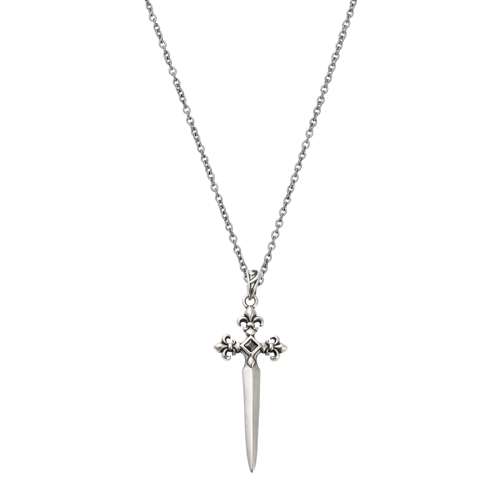 Die Knight of Shadows Sword Kette vereint die Eleganz eines alten Ordens mit der Kraft eines Schattenkriegers. Der kunstvoll verzierte Schwertanhänger zeigt feine, beinahe königliche Ornamente, die an historische Rüstungen erinnern – und im Zentrum des Kreuzstücks thront ein facettierter schwarzer Stein, der geheimnisvoll schimmert und dem Schmuckstück eine tiefe, magische Aura verleiht.