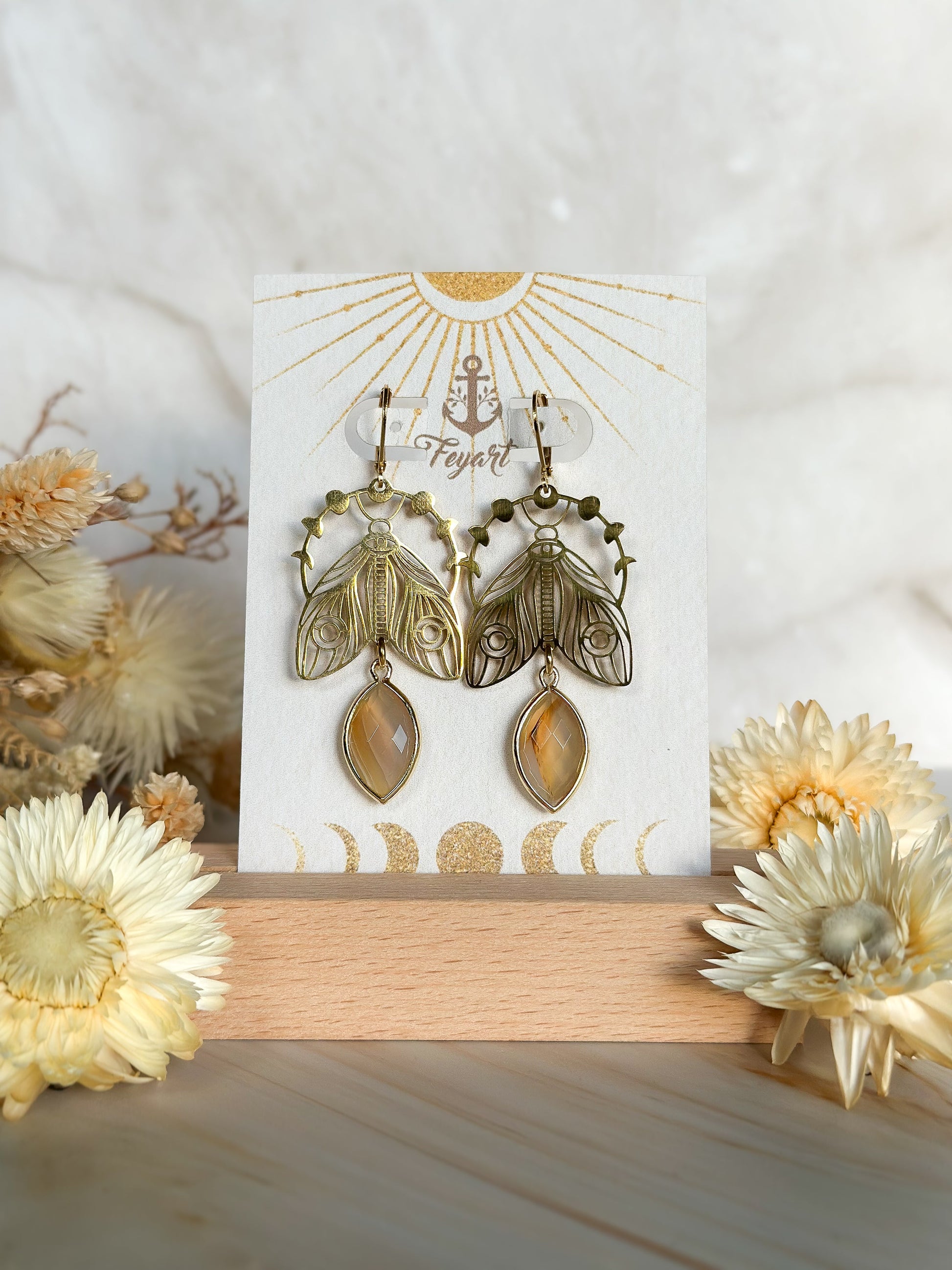 Diese mystischen Ohrringe zeigen ein kunstvoll gestaltetes Nachtpfauenauge – eine der schönsten Motten der Nacht. Über ihr erheben sich die Mondphasen, die den ewigen Kreislauf von Wandel, Licht und Schatten symbolisieren.